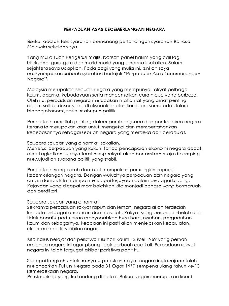 Yang mulia tuan pengerusi majlis, barisan panel hakim yang adil . © © all rights reserved. Berikut adalah teks syarahan pemenang pertandingan syarahan bahasa malaysia sekolah saya. Johan pertandingan bicara berirama sekolah menengah peringkat kebangsaan 2019. Sukatan pelajaran bahasa arab, kurikulum bersepadu sekolah menengah. Ada banyak yang dikongsikan bagi anda menulis.